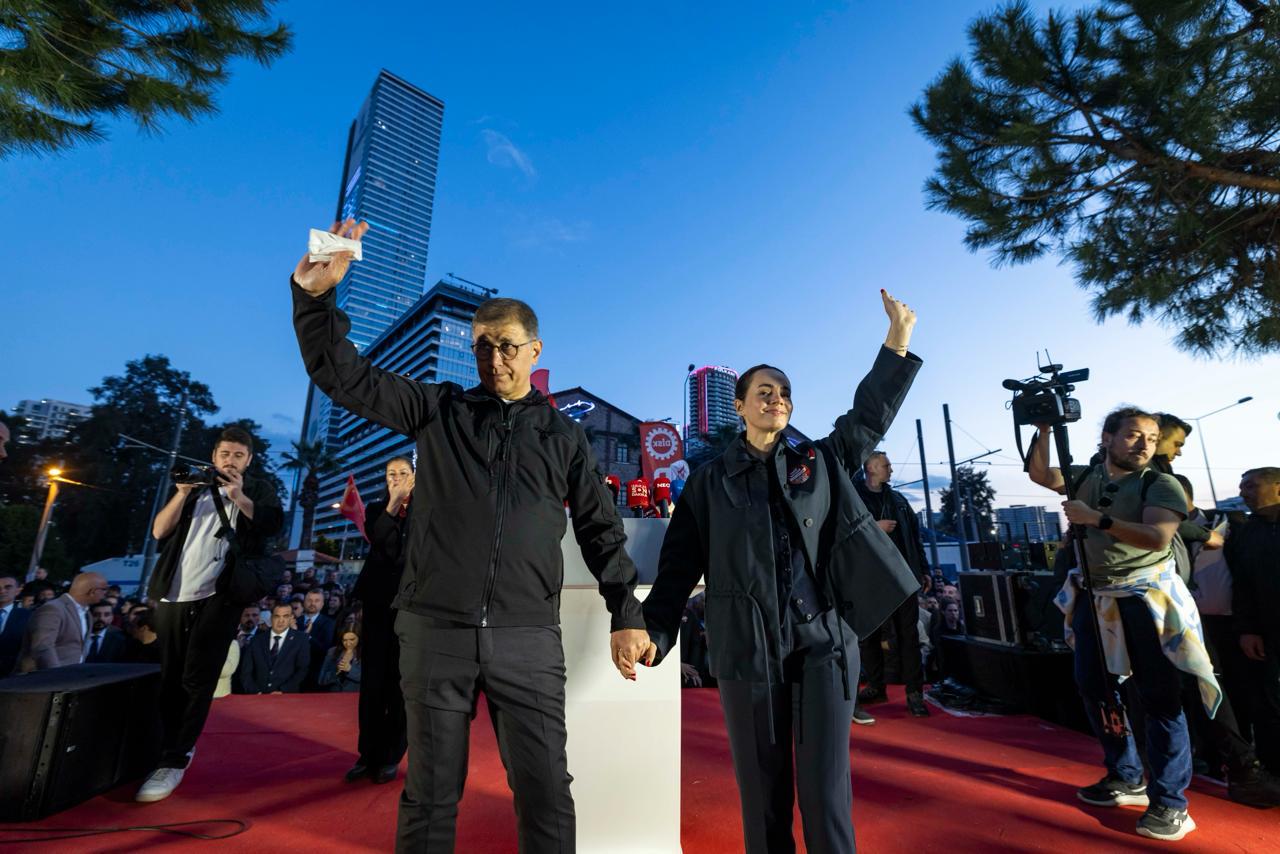İzmir Büyükşehir Belediye Başkanı Dr. Cemil Tugay, sahneye eşi Öznur Tugay ile birlikte çıktı. Topluluğu selamlayan Başkan Tugay, “Büyük bir fedakarlıkla buraya geldiğiniz için hepinize yürekten teşekkür ediyorum. Buraya gelemeyenler sanmasınlar ki onlara selamımız yok, bizi izleyenlere selam gönderiyorum” dedi.