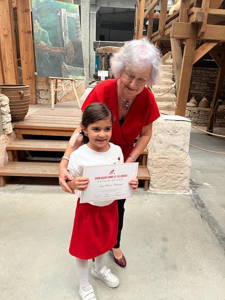 Ekim Geçidi Sergilerinin mimarı Sanatçı Gülsün Erbil ve organizasyonun İzmir Temsilcisi Feriha Dağlı sanatçılara katılım belgelerini birlikte takdim ettiler.