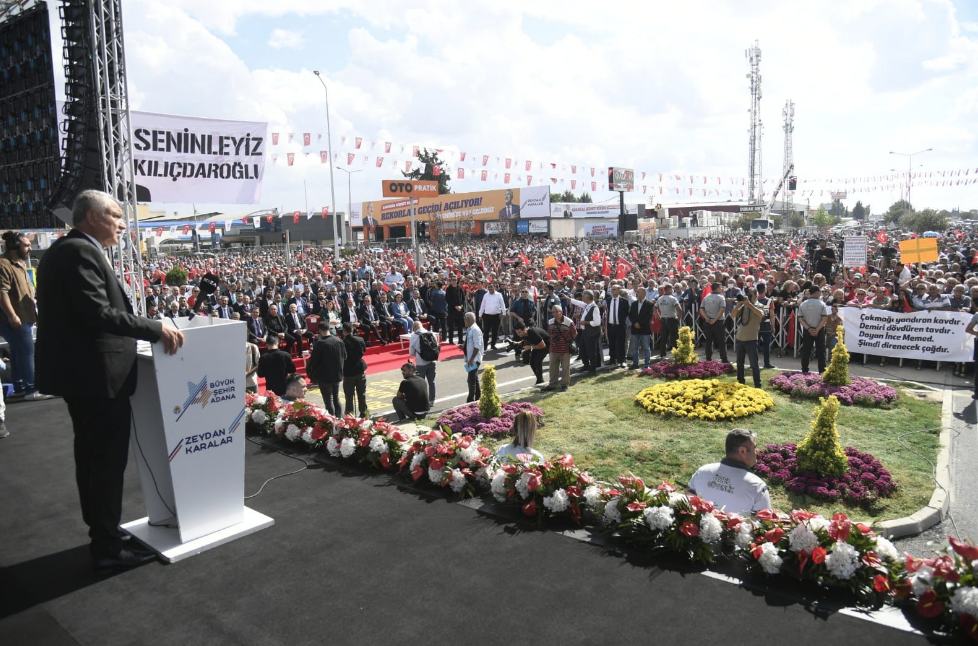 300 metrelik Otogar Altgeçidi’nin 90 gün dolmadan, Adana için rekor sürede hizmete girmesi, Kent Meydanı Öğrenci Yurdu’nun açılışı, 2 gündüz bakımevinin açılışı, mahalleevi açılışı, 2 kurs merkezinin açılışı, 15 bin tonluk su deposunun yapımı, Ceyhan İçme Suyu Hattı,  gündüz bakımevi temelinin atılması, kadın sığınmaevinin temelinin atılması, 81 otobüs alımı, 153 iş makinesi alımı ve 5 bin halk kart dağıtımı gibi Adana için çok önemli hizmetler nedeniyle gerçekleştirilen törende konuşan Adana Büyükşehir Belediye Başkanı Zeydan Karalar, CHP Genel Başkanı Kemal Kılıçdaroğlu ile diğer konuklara ve törene katılan Adanalılara teşekkür etti.