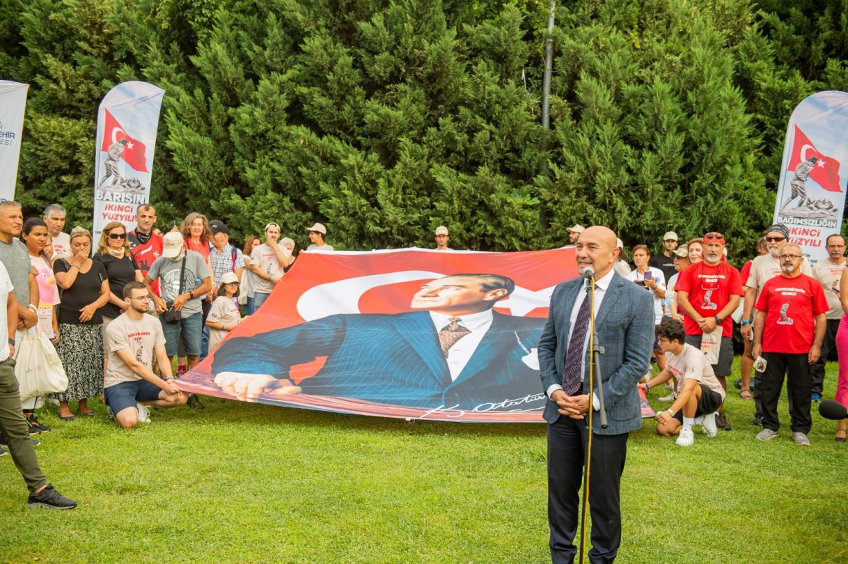 Uğurlamada Başkan Tunç Soyer’e Türkiye Muharip Gaziler Derneği üyeleri, Türkiye Harp Malulü Gaziler Şehit Dul ve Yetimleri Derneği temsilcileri, İzmir Büyükşehir Belediyesi bürokratları, İzmir Büyükşehir Belediyesi Genç İzmir gönüllü takımı, kafiledeki sporcular ve çok sayıda İzmirli eşlik etti. Törende Başkan Tunç Soyer, “100 yıl önce atalarımız bu cennet vatanı bize emanet etmek için olağanüstü bir zafer kazandı. O zafer yolculuğu 100 yıl önce başladı. Kanları, canları pahasına kazandıkları o zaferle yeni bir devlet kuruldu, Cumhuriyet kuruldu. Ülkemiz demokrasinin, tam bağımsızlığın, özgürlüğün ve barışın memleketi oldu. Atalarımızla iftihar ediyoruz. Bugün gelecek nesillere yine bu eşsiz vatanı emanet etmenin heyecanını yaşıyoruz. Bu muazzam zaferin ilk adımlarını atmak için bugün İzmir’den yola çıkıyorsunuz. Yolunuz açık olsun, ayağınıza taş değmesin” dedi.